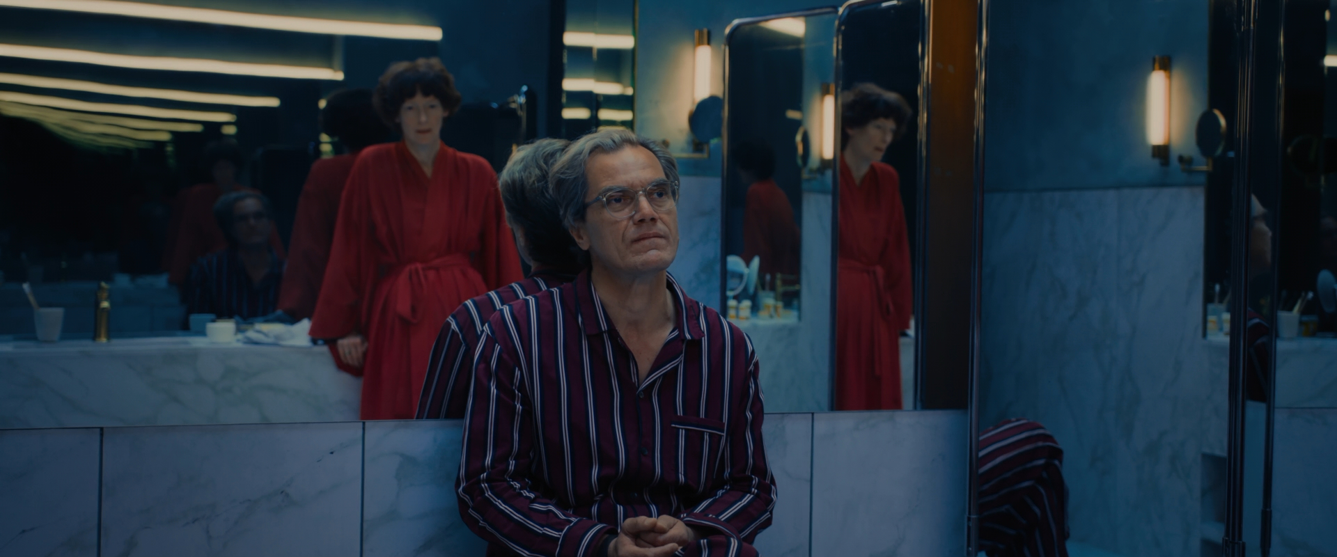 These questions led Oppenheimer to The End, the filmmaker’s first narrative work starring Michael Shannon (Father) and Tilda Swinton (Mother), which sees an oil baron and his family live out the End Times from the vantage point of their bunker—equipped with a swimming pool, a library, enough food for fish suppers with soured wine, and 19th century paintings on each wall, many of them proudly romanticising American expansionism.  Father, Mother, Friend, Doctor, Butler, Son have been successfully clinging to normality, until the arrival of a stranger, Girl (Moses Ingram), pokes a hole in their self-delusion and calls attention to their complicity in the ruined world up above.