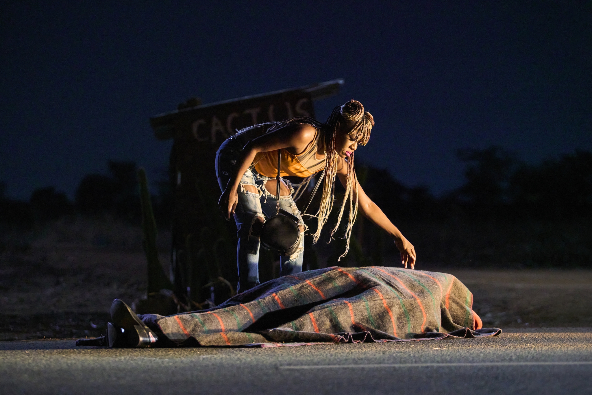 “Film is about making things tangible, right? Like how do you deal with your past? Why do you stumble across it on a dark road?” The Zambian-Welsh director Rungano Nyoni is talking to me about the opening sequence of her second feature On Becoming a Guinea Fowl. Shula (Susan Chardy), recently back in town, is driving back from a fancy dress party, when, just down the road from a brothel, she encounters a corpse in the empty street. It is Uncle Fred, her mother’s brother who sexually abused her—and other female family members—as a child. After sitting for several moments, Her cousin, Nsansa (Elizabeth Chisela), arrives, banging at the window. Shula is reluctant to let her in.