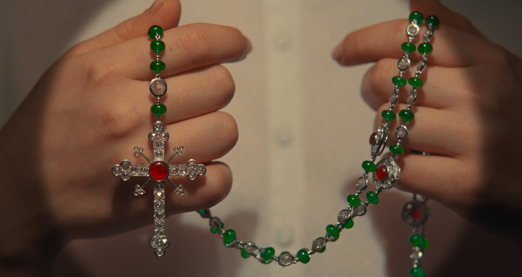 The film’s style is a throwback to the gripping and glamorous cross-country adventures of the early twentieth-century. There are examples of luxury items in Korda’s home – all used to convey a sense of his character. But one stands out above all else. Anderson requested a bespoke rosary inspired by the house’s cross pendant made in 1880 (the original is a part of the Cartier Collection). It is worn by Threapleton throughout the film, replacing her basic wooden one, and is shown frequently as she changes from pious and humble to her father’s daughter, with a penchant for the finer things. The piece itself is a genuine piece of craftsmanship, combining emeralds and rubies in stylised circular motifs with square-shaped diamonds. If we were going to conceptualise a creation worthy of that era’s magic – so beautiful it only adds to the actor’s charm – this would be it. We imagine it becoming another iconic piece in the future.