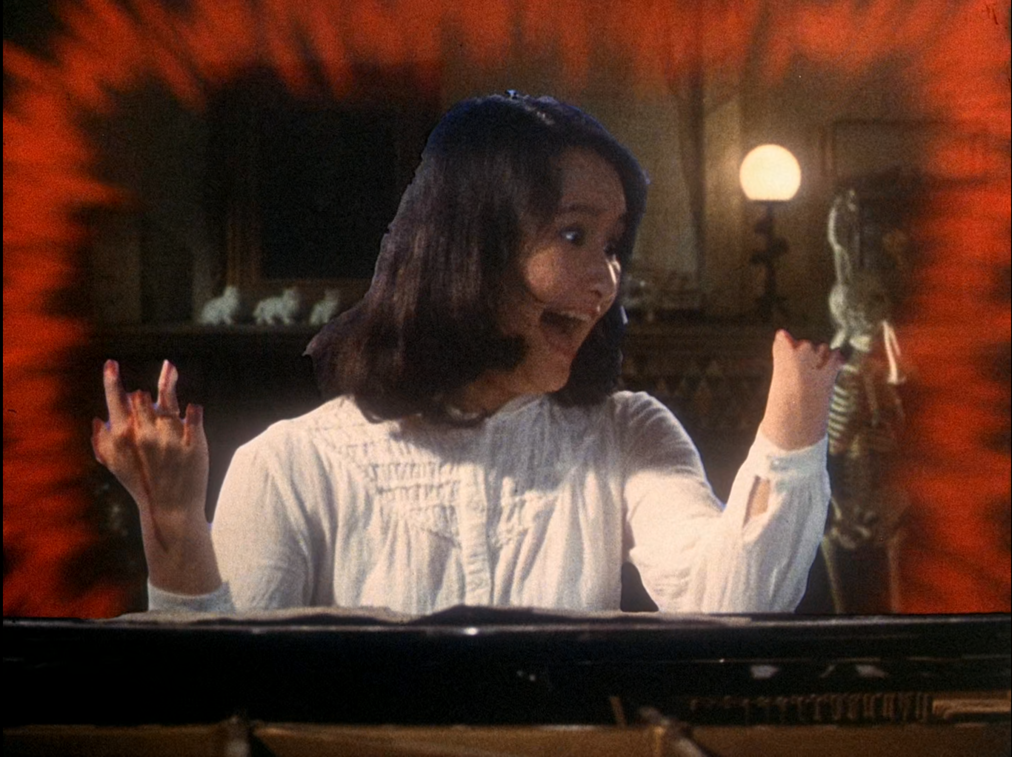 The horror house isn’t all doom and gloom, though. Look to cult Japanese filmmaker Nobuhiko Obayashi, whose film House (1977) uses DIY cinema magic to paint a zany, charming and endlessly inventive picture of seven schoolgirls whose vacation at  their classmate’s ancestral countryside home turns nightmarish when the house itself turns against them. Conceiving of the film after his 12-year-old daughter expressed her fear that she would be eaten by her bedroom mirror, Obayashi has a ball literalising the concept of the horror house, weaponising every household object you can imagine against his plucky protagonists. In one scene, a grand piano grows an appetite and chomps the hands of the ironically named Melody, who holds them up to the audience to reveal glowing stumps where her fingers used to be. Other hijinks include an evil house cat stalking the teens, the attack of the killer mattresses, and, notably, a young girl getting swallowed up by her bedroom mirror. It’s a credit to Obayashi’s understanding of horror that despite the ludicrous nature of the film, House refuses to surrender the devilishness that is core to the genre. By coincidence or not, exactly a decade after the release of House, American independent Sam Raimi released Evil Dead II (1987), which reimagines the story of the first Evil Dead (1981), this time with the pulp dialled up and the tone of the film altered to suit the cartoonish artificiality of low-budget filmmaking. In both Raimi and Obayashi’s films, terror and comedy skip merrily together through the creaky corridors of their horror homes.
