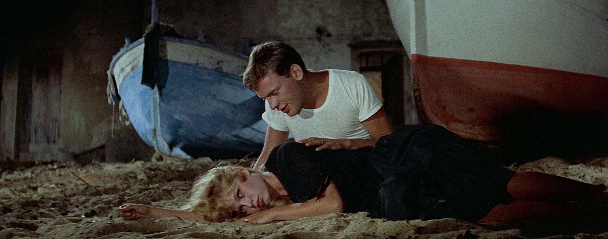Juliette does fight back against the film’s relentless forward motion. Frustrated at her marriage and acting ever more bizarrely, she takes out one of the Tardieu boats. It catches fire, and when Antoine comes to save her they jump ship and have sex on the sand. The culminating scene, in which a liberated Juliette drinks and dances to cha-cha music at the Bar des Amis (note, elsewhere, her lack of friends), is rightly labelled by some as racially insensitive, her ‘primitive’ sexuality associated with the music played by black men. But there is a fitting stubbornness in the two-step-forward, one-step-back rhythms, and the movements of a camera, which, while chopping up her body, fails to track her neatly. The scene culminates when her husband tries to shoot her but is stopped by Eric. Eric and Antoine—spooked— now seem conscious that Juliette is not there to shore up their masculinity. “That girl was made to destroy men,” says the businessman, as he drives them both off down the coast, onwards, ceaselessly to the next beautiful village, where a new tragedy awaits.